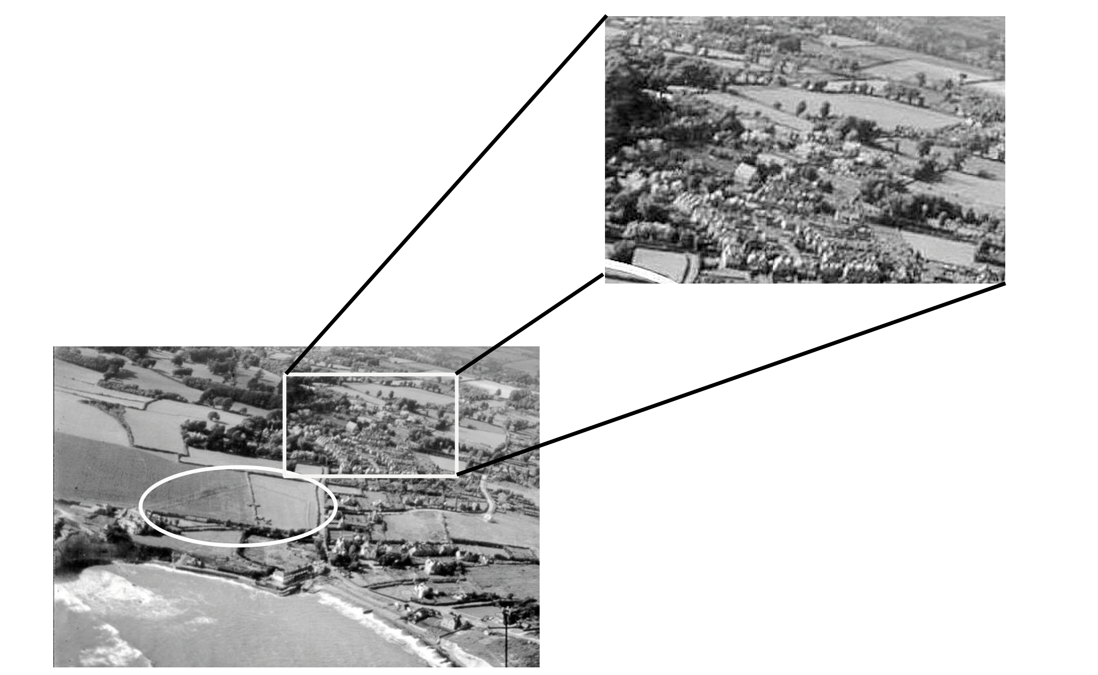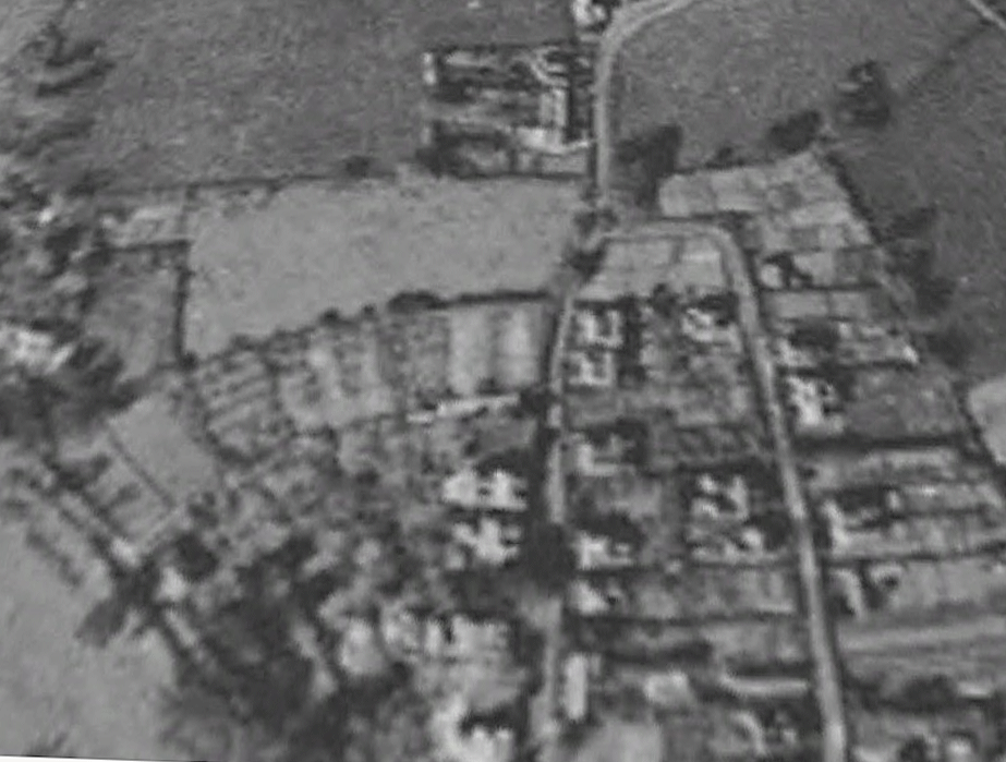 An aerial photograph taken in 1941 showing the barbed wire perimeter fences of the 6 pounder gun and other temporary defence structures in a field to the left of Gate Lane.