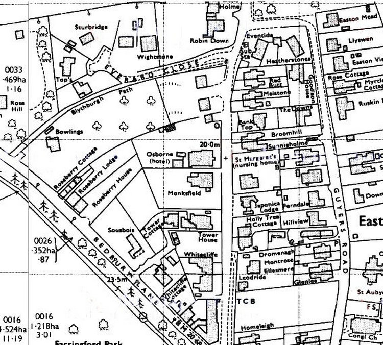 An OS map from 1970. I understand that Everard Close was build in 1962. The early phase is shown here and Bowlings with its long garden. The hotel is shown but it has lost much of its ground to two new houses in Victoria Road. I may have got that wrong.